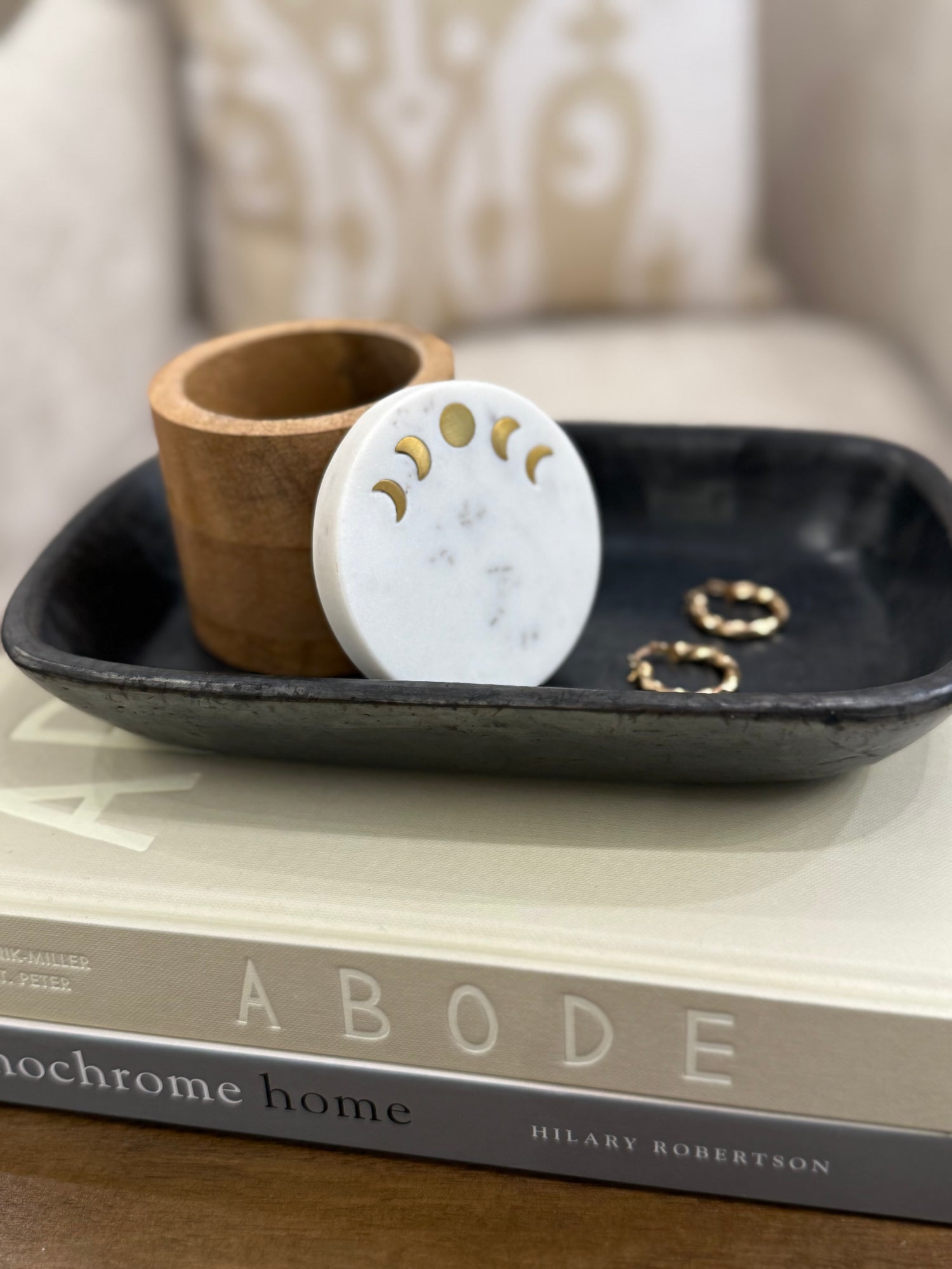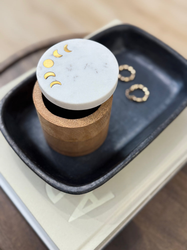 • Versatile and beautifully crafted, this keepsake box is perfect for stylish storage throughout the home. Handcrafted by skilled artisans in India, it features a unique blend of marble and responsibly sourced mango wood. The lid is delicately inlaid with a brass lunar moon phase design, adding a celestial touch. For best care, hand wash only. Pair it with other items from the collection to create a thoughtful display—ideal for wedding gifts or shower inspiration.